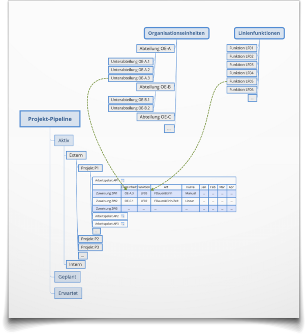 - Arbeitspakete: Jedes Arbeitspaket beschreibt eine abgegrenzte, wohldefinierte Menge an auszuführenden Arbeiten und ist Teil eines Projekts oder internen Auftrags. In ihrer Gesamtheit bilden Arbeitspakete die strukturierte Sicht der Linienorganisation auf die Gesamtheit der zu erbringenden Leistungen. Da die Kapazitätsplanung das Ziel verfolgt, eine möglichst langfristige, vollständige und genaue Prognose für den Mitarbeiterbedarf zu erzeugen, werden auch Arbeitspakete in Projekten erfasst, die nur möglicherweise zur Ausführung kommen. Projekte werden entsprechend in eine übergeordnete Pipeline eingeordnet, die neben den bestehenden oder absehbaren Auftragsprojekten auch sämtliche internen Vorhaben bis hin zu Absenzplanungen erfasst.